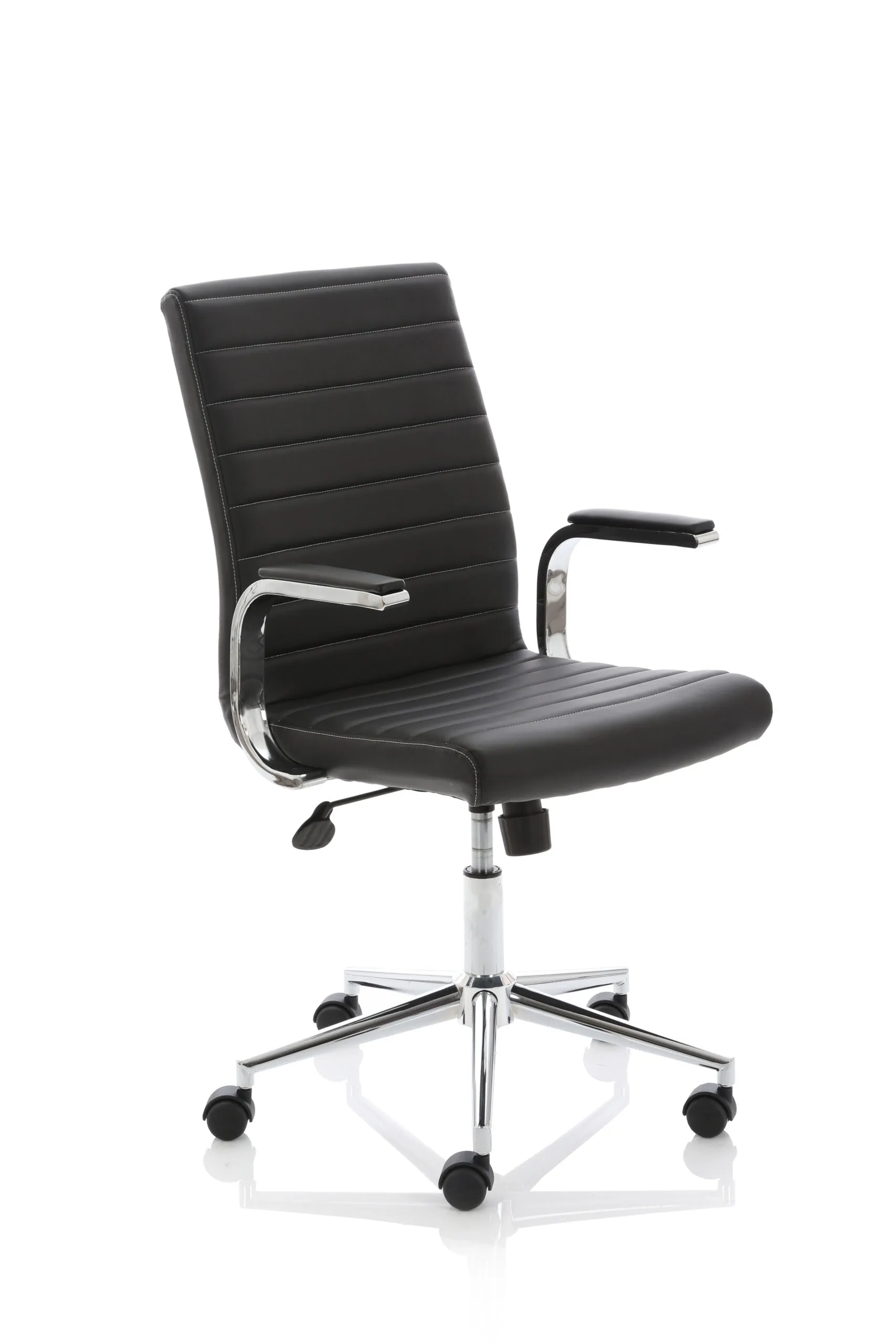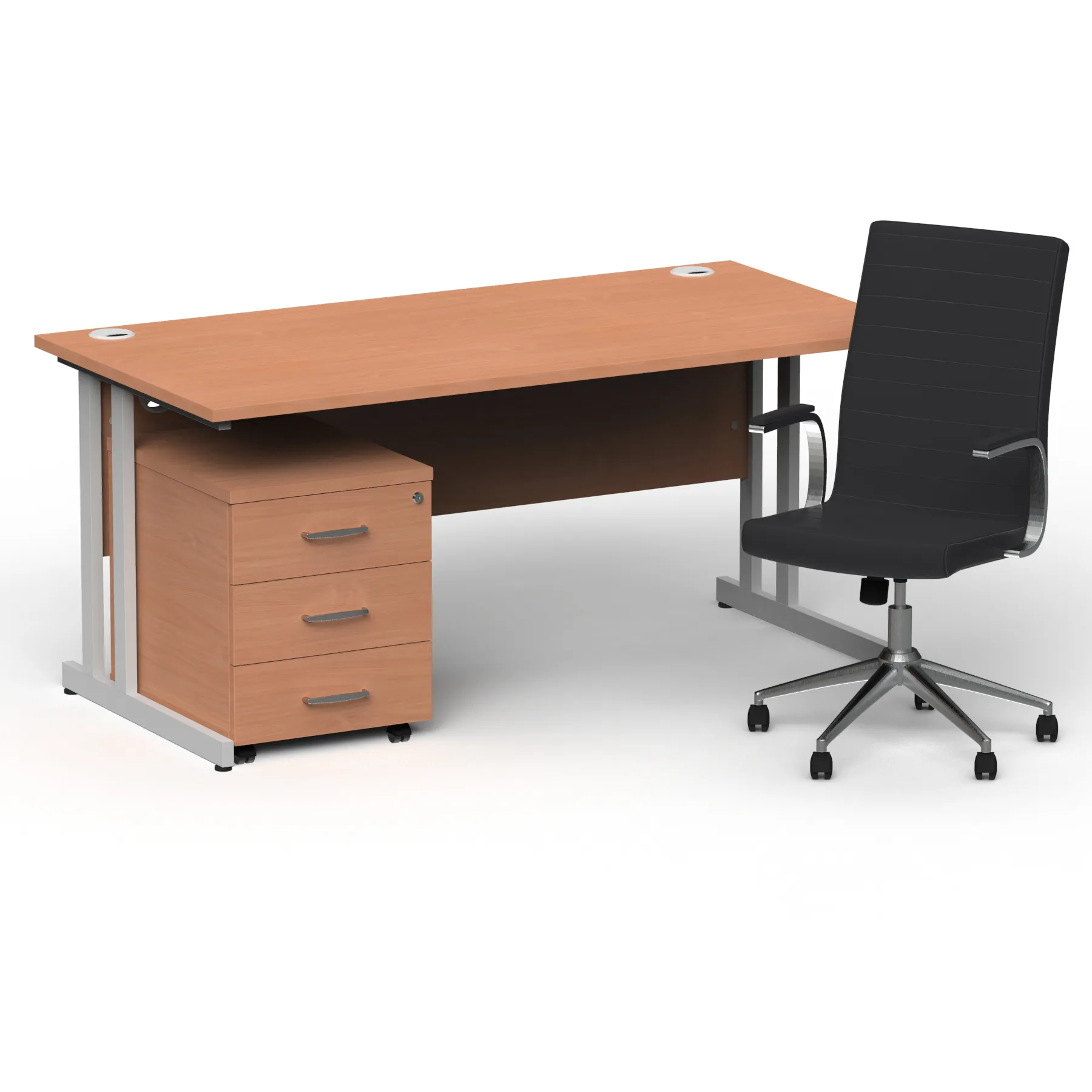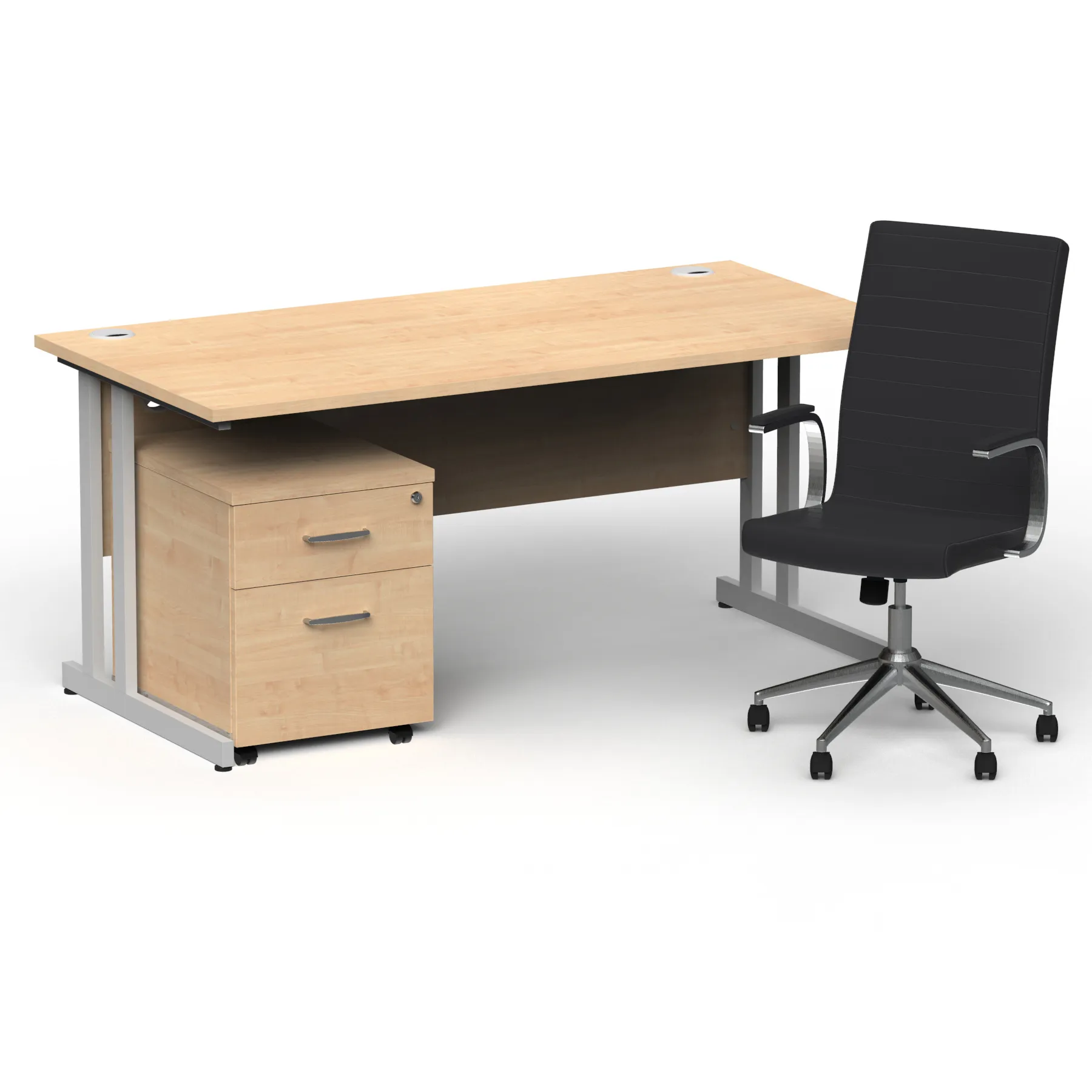 Impulse contract desk | 25mm tops | Heat resistant melamine finish | 18mm modesty panel | Double strut legs | Steel to steel fixings | Impulse mobile pedestal | Steel handles | Smooth running castors for mobility | Lockable drawers | Solid drawer construction | Ezra executive chair | Stylish stich detail | Soft touch bonded leather | Single lever lock tilt mechanism | Weight tension adjustment | Fixed padded arms | Gas lift tested up to 150kg | Usage: 8 hours