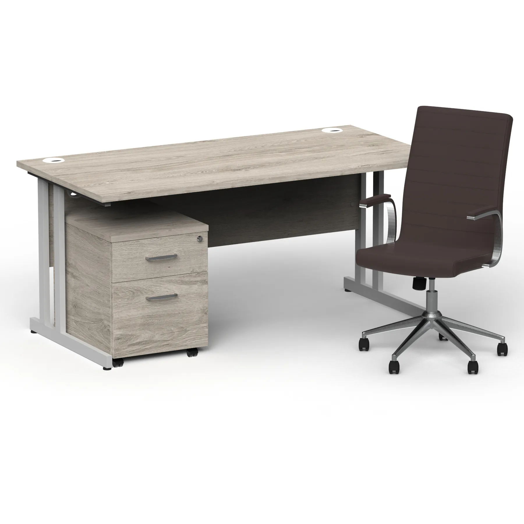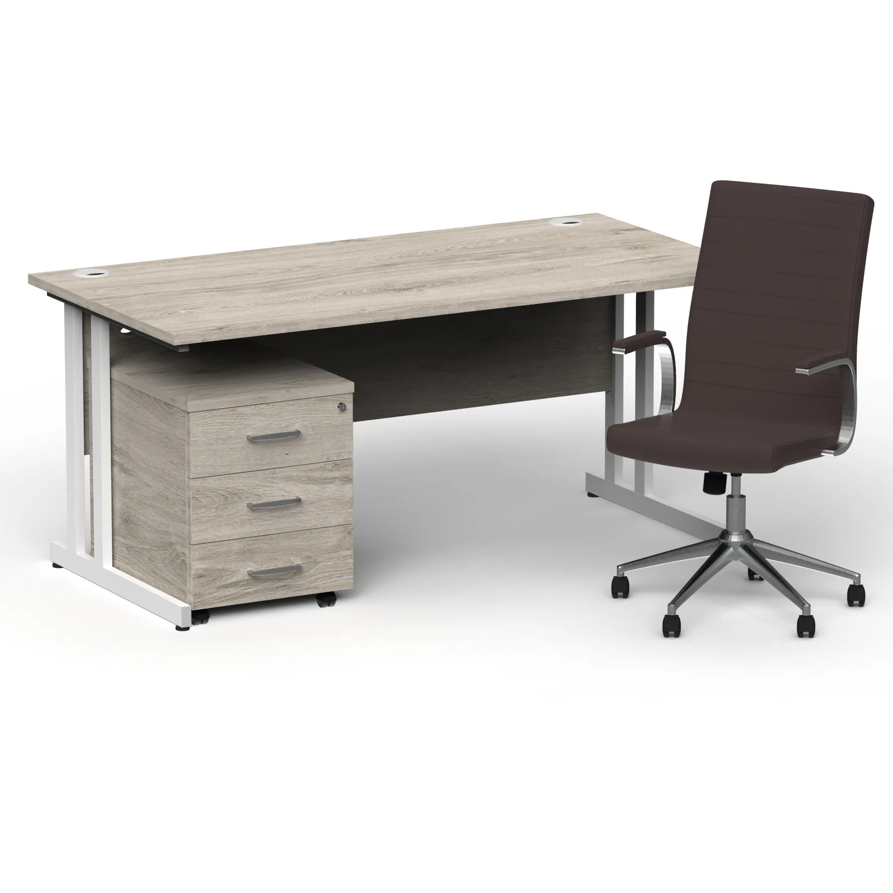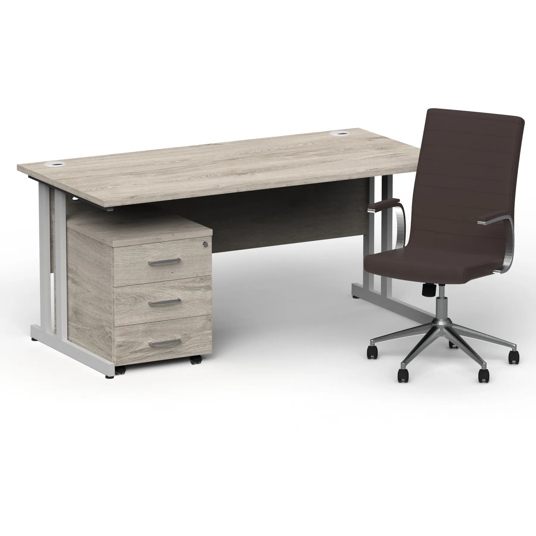 Impulse contract desk | 25mm tops | Heat resistant melamine finish | 18mm modesty panel | Double strut legs | Steel to steel fixings | Impulse mobile pedestal | Steel handles | Smooth running castors for mobility | Lockable drawers | Solid drawer construction | Ezra executive chair | Stylish stich detail | Soft touch bonded leather | Single lever lock tilt mechanism | Weight tension adjustment | Fixed padded arms | Gas lift tested up to 150kg | Usage: 8 hours