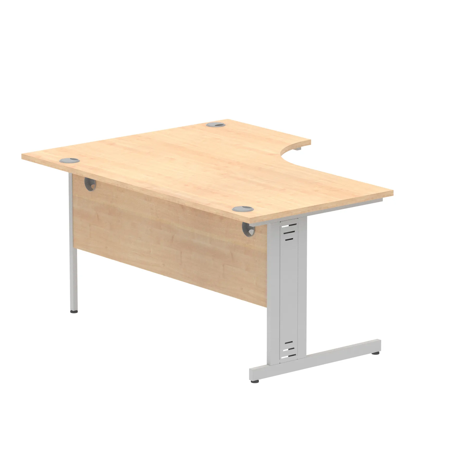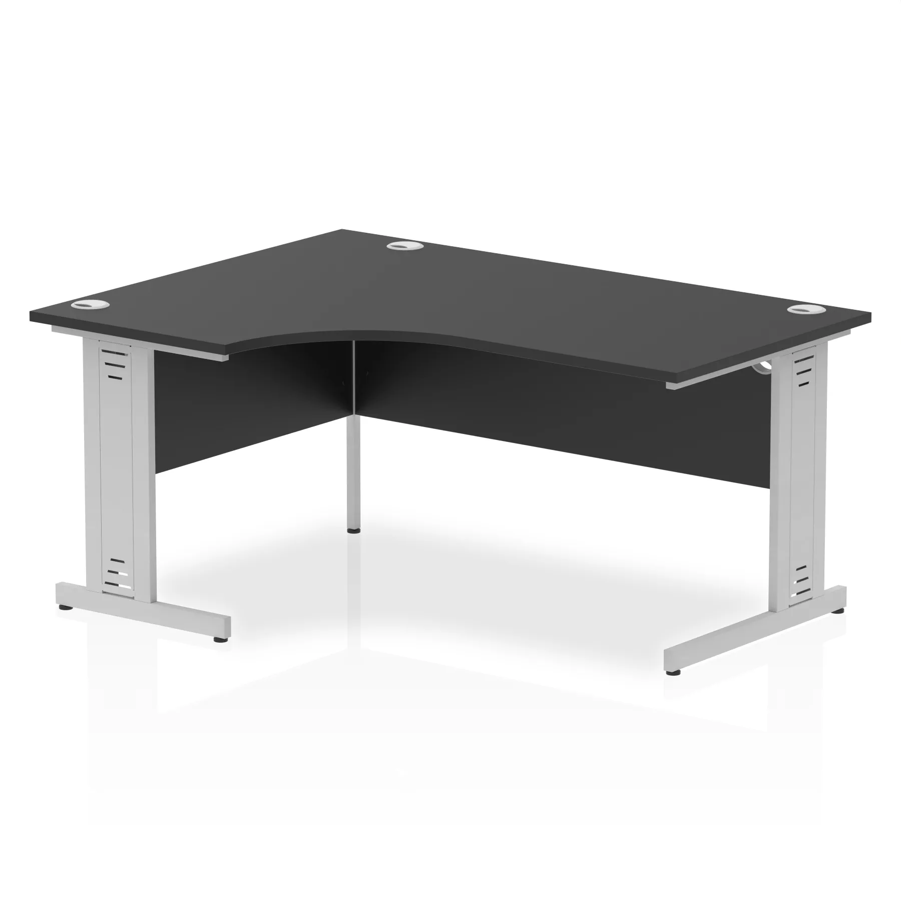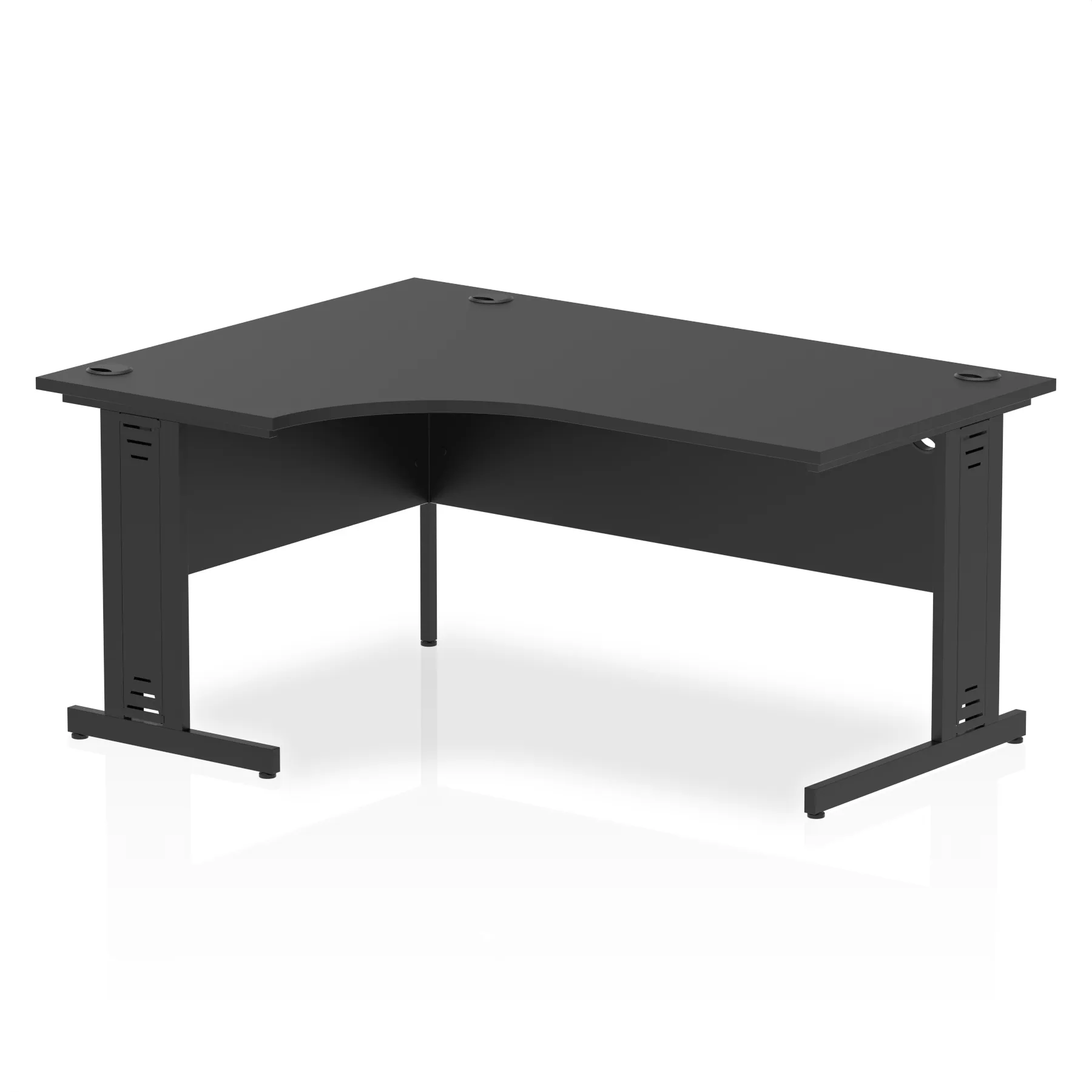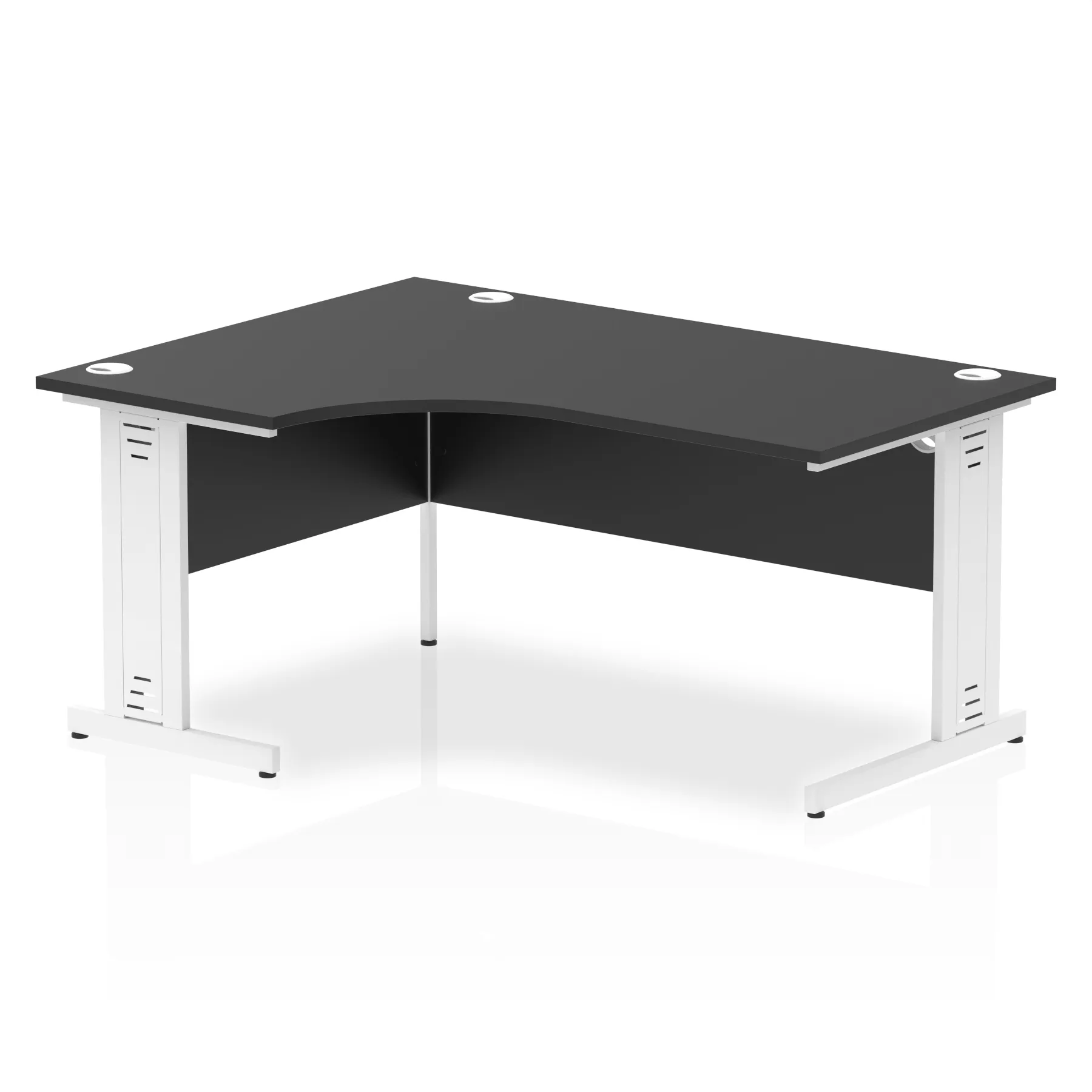 • Impulse contract 1600 wide crescent desk • 25mm tops • Heat resistant melamine finish • 18mm modesty panels • 2mm protective abs edging • Double strut legs • 3 cable ports • Height adjustable feet • Steel to steel fixings • 3 modesty panels slots • 600 deep • Deep set modesty panel (5″) allows for compatibility of most screen clamp fittings • Weight Capacity: 135Kg