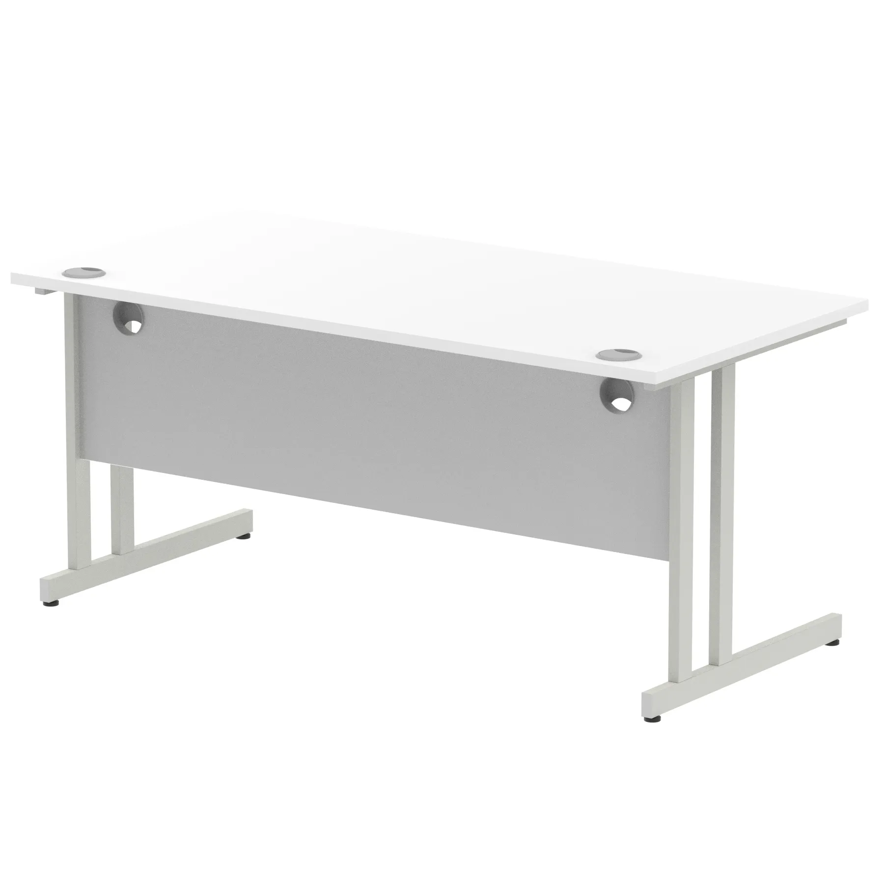 Impulse contract desk | 25mm tops | Heat resistant melamine finish | 18mm modesty panels | 2mm protective abs edging | Silver coated double strut legs | 2 cable ports | Height adjustable feet | Steel to steel fixings | 2 modesty panels slots Deep set modesty panel (5″) allows for compatibility of most screen clamp fittings | Weight Capacity 135Kg