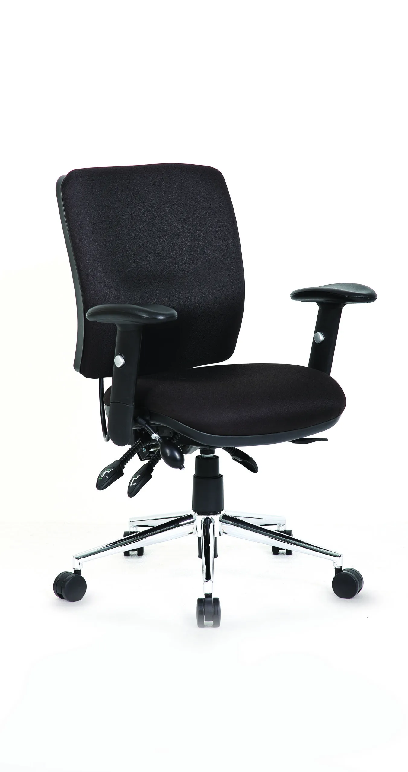 Impulse contract desk | 25mm tops | Heat resistant melamine finish | 18mm modesty panel | Double strut legs | Steel to steel fixings | Impulse mobile pedestal | Steel handles | Smooth running castors for mobility | Lockable drawers | Solid drawer construction | Chiro medium chair | Posture chair UK Chiropractic Doctor approved | Height adjustable back and seat | Pump lumbar support | Triple lever independent mechanism | Independent seat and backrest tilt angle adjustment | Gas lift tested up to 150kg | Usage: Task 24/7