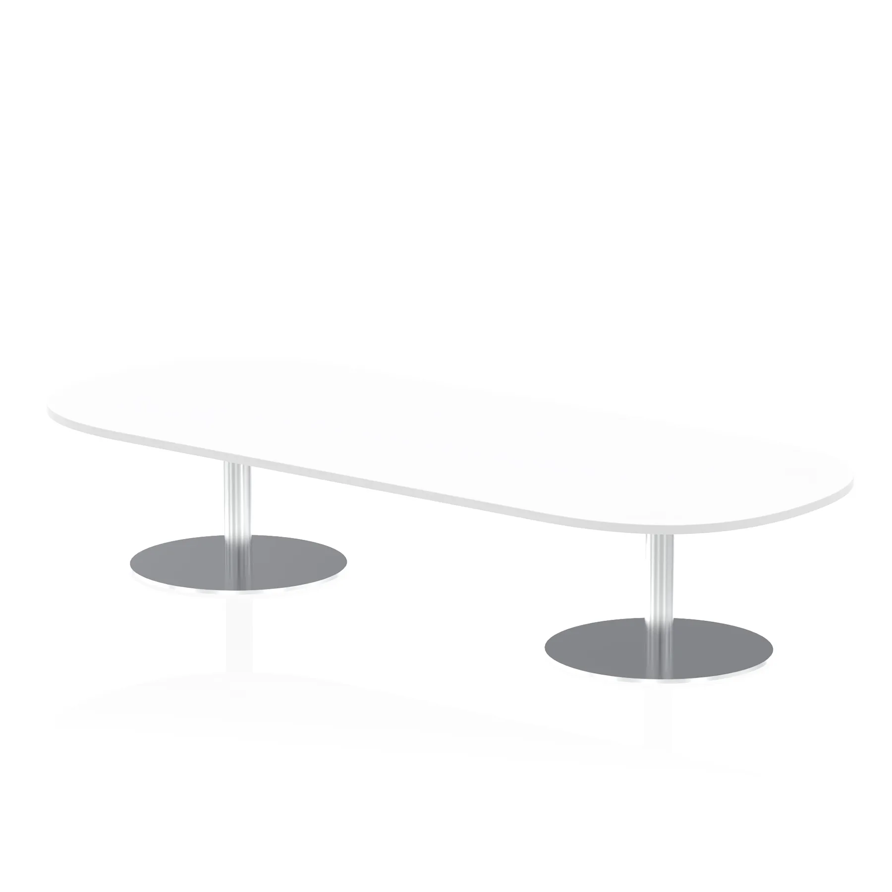 25mm thick desk top profile | Dual, brushed stainless steel effect circular base (580mm diameter) | Brushed stainless steel pillars (76mm diameter) | Weighted base provides stability | Two part bolted frame system