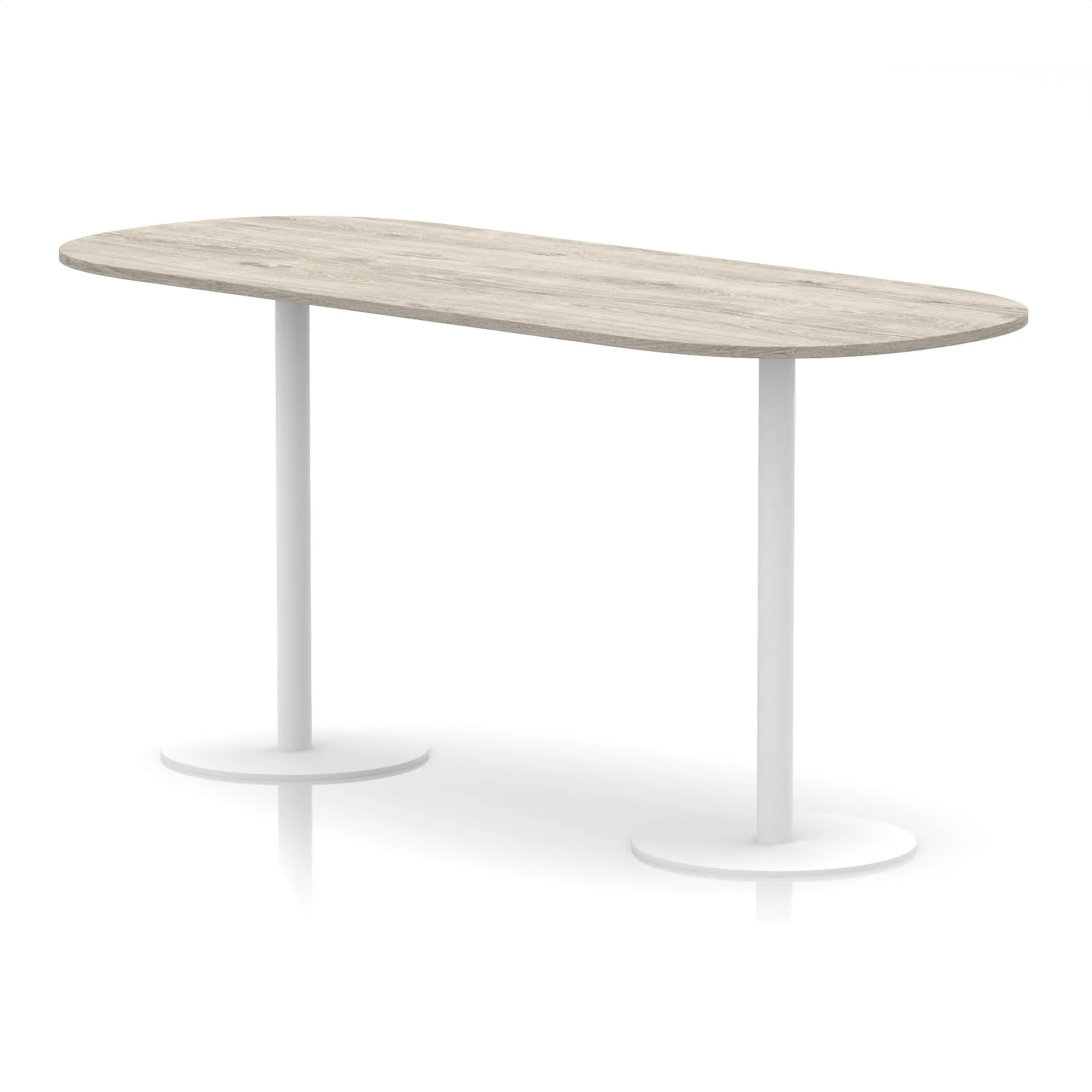 25mm thick desk top profile | Dual, brushed stainless steel effect circular base (580mm diameter) | Brushed stainless steel pillars (76mm diameter) | Weighted base provides stability | Two part bolted frame system