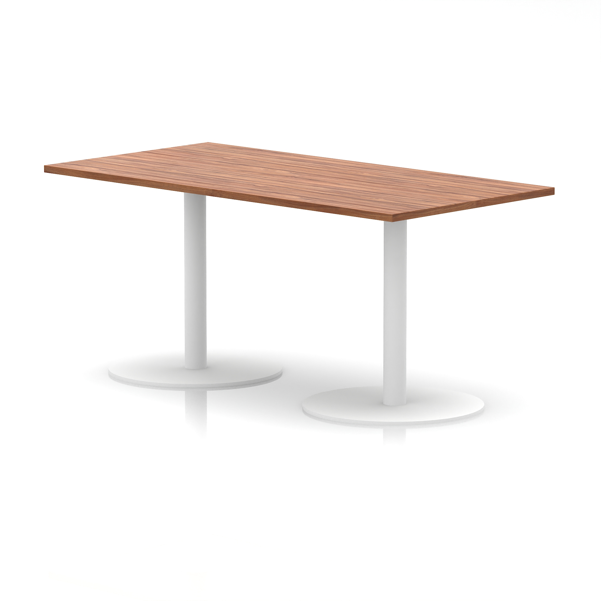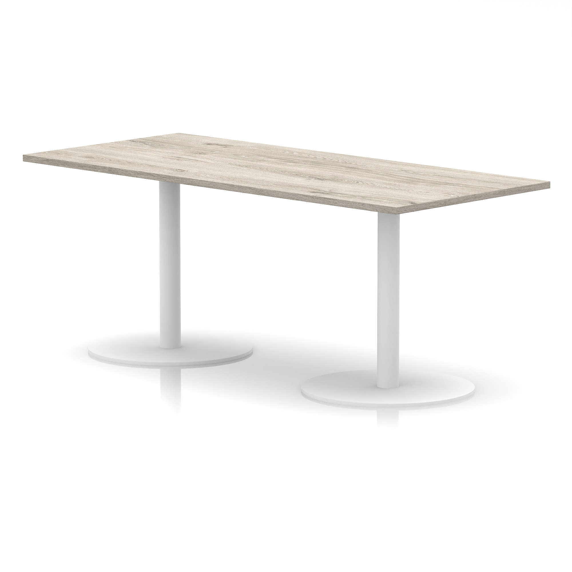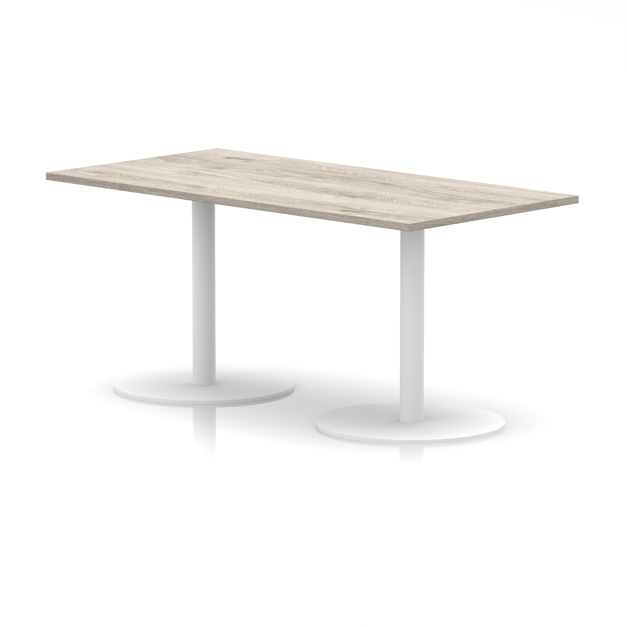 25mm thick desk top profile | Dual, brushed stainless steel effect circular base (580mm diameter) | Brushed stainless steel pillars (76mm diameter) | Weighted base provides stability | Two part bolted frame system
