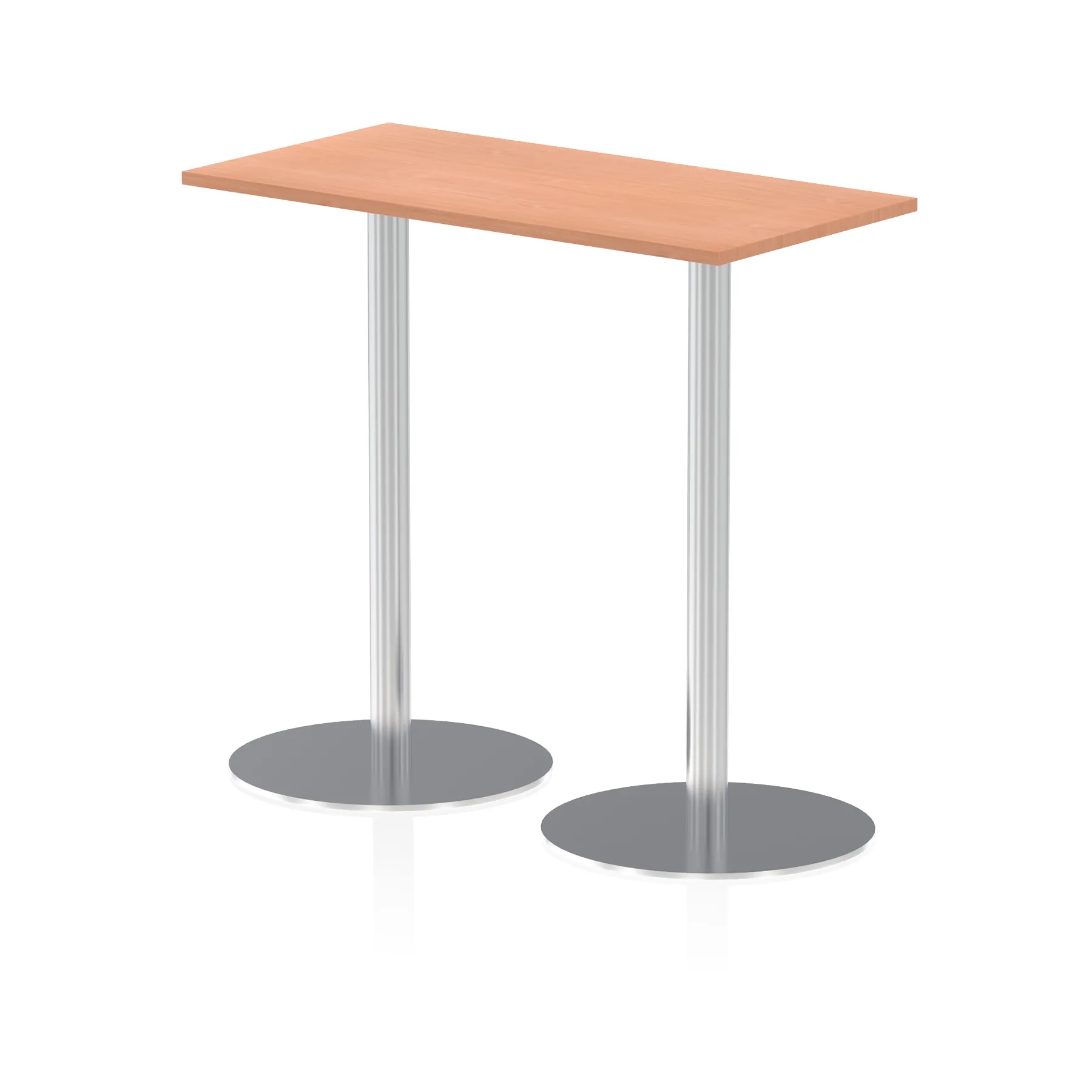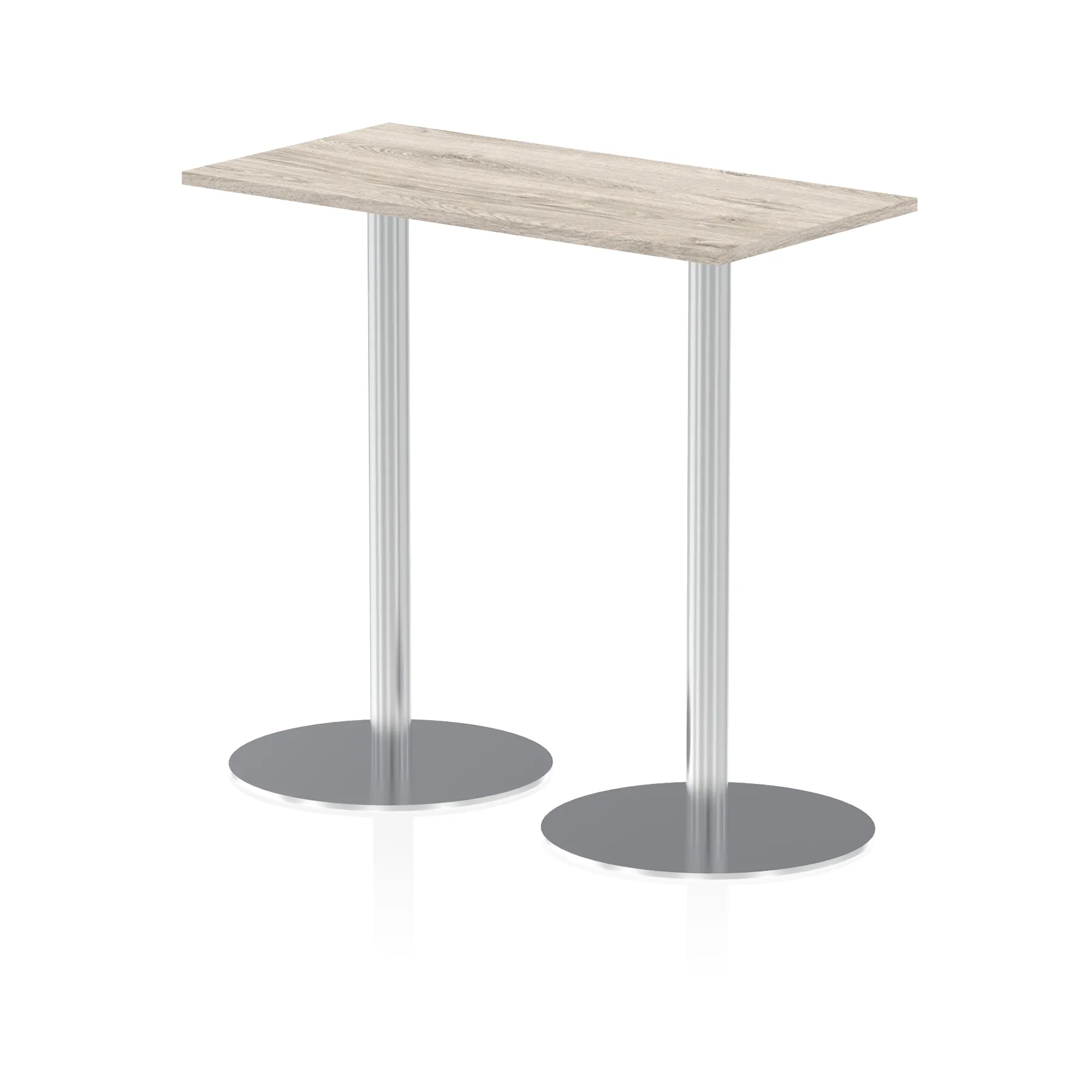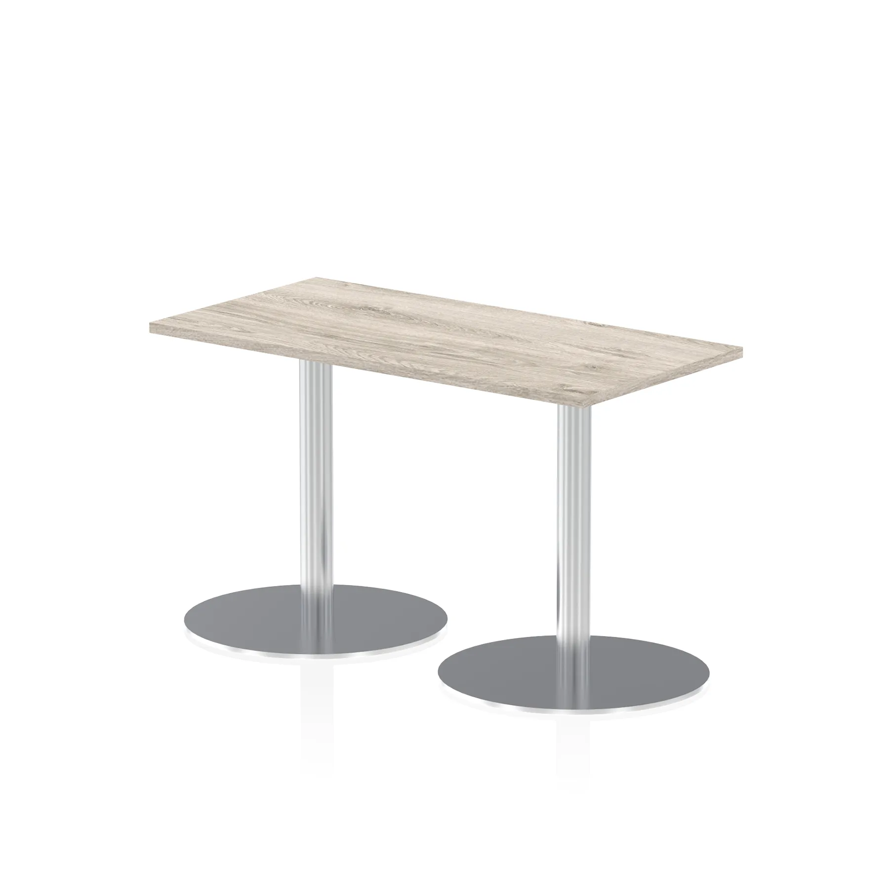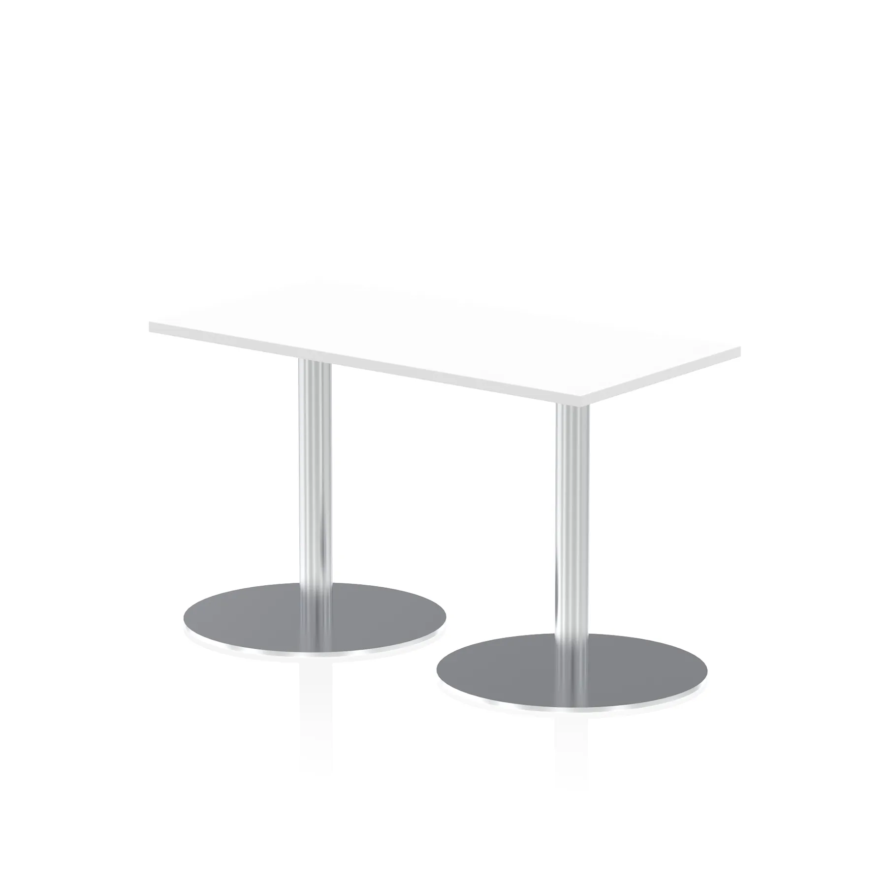 25mm thick desk top profile | Dual, brushed stainless steel effect circular base (580mm diameter) | Brushed stainless steel pillars (76mm diameter) | Weighted base provides stability | Two part bolted frame system