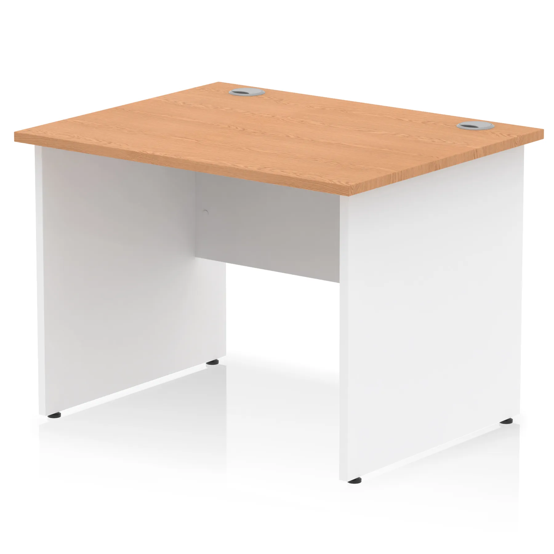 Impulse contract desk | 25mm tops | Heat resistant melamine finish | 18mm modesty panel | 2mm protective abs edging | Matching wood panel end legs | 2 cable ports | Height adjustable feet | Steel to steel fixings | 2 modesty panel slots | Deep set modesty panel (5″) allows for compatibility of most screen clamp fittings | Weight Capacity 135Kg