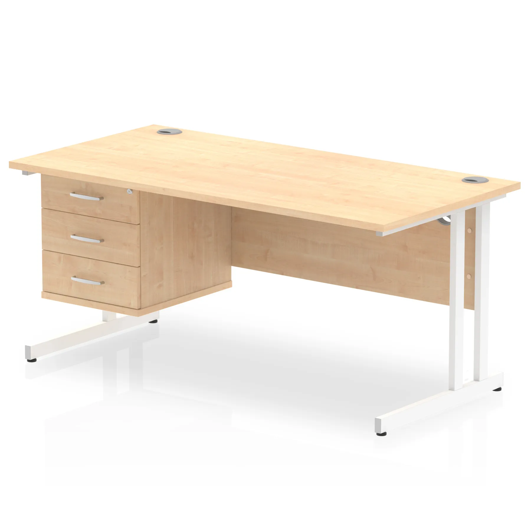 • Impulse contract 1600 wide desk • 25mm tops • Heat resistant Beech melamine finish • 18mm modesty panels • 2mm protective abs edging • White coated double strut legs • 2 cable ports • Height adjustable feet • Steel to steel fixings • 2 modesty panels slots • Deep set modesty panel (5”) allows for compatibility of most screen clamp fittings • Fixed pedestal