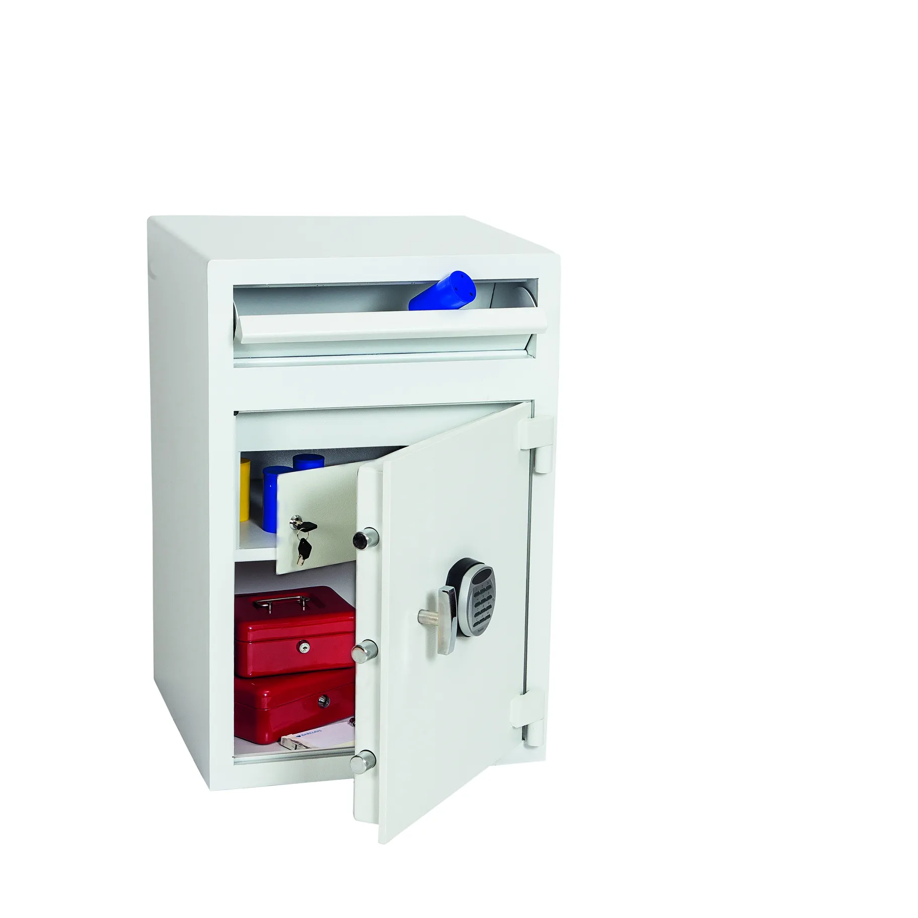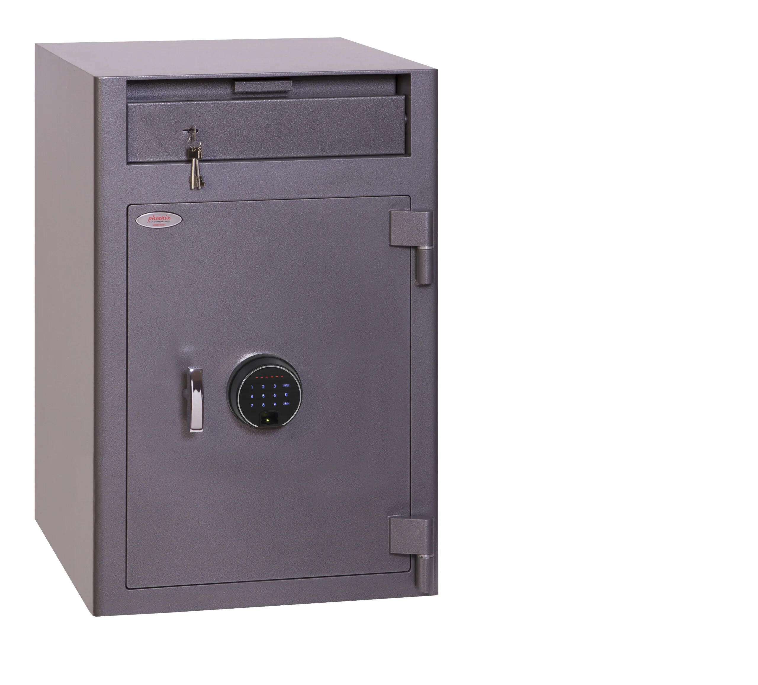 SECURITY PROTECTION – Recommended for overnight cash cover of £3,000 cash or £30,000 valuables | DEPOSIT FACILITY – 100H x 415W x 220D – Fitted with a special Phoenix baffle plate to ensure the contents cannot be fished out. Also features a night lockout plate for increased security during out of hours | SPECIAL FEATURES – Size 3 safes fitted with separate lockable coffer for added security | CONSTRUCTION – Constructed of 12mm steel plate door and 6mm body | FIXING – Ready prepared for floor fixing with fixing bolts for concrete supplied | PAINT – Finished in a high quality scratch resistant paint