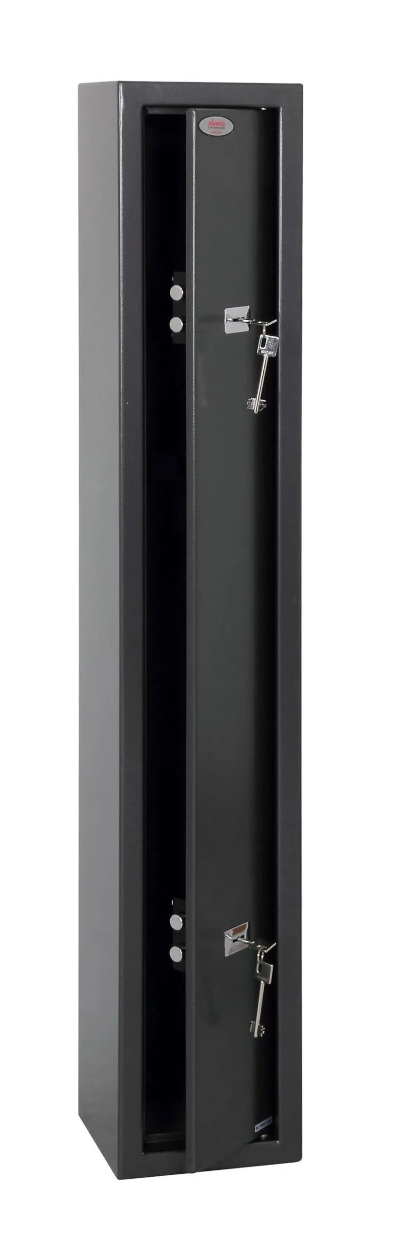 SECURITY PROTECTION – Tested to British Standard BS7558/92. 100% Police Approved | NO. OF GUNS – 1, 2 or 6 | LOCKING – Two high security 7 lever locks supplied with two double bitted keys | CONSTRUCTION – Galvanised steel body and door. High density foam divider and floor mat | FIXING – Ready prepared for fixing to the floor or wall, with fixing bolts supplied | COLOUR – Finished in a high quality durable Metallic Graphite paint.