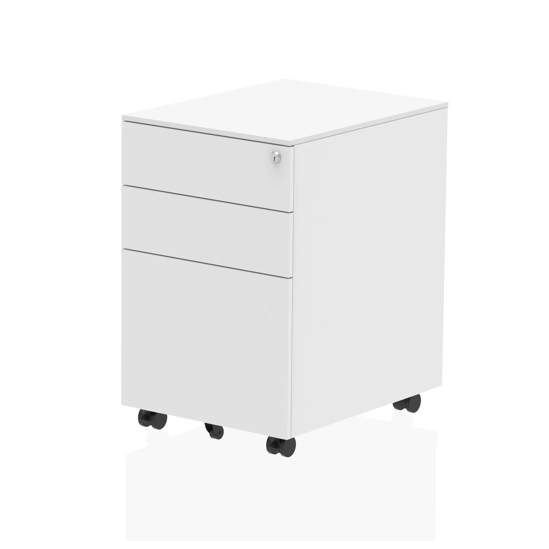 High quality steel pedestals | Bright, black tough finish | Fitted with easy run castors | Easy glide runners for smooth drawer operation | Lockable drawers | Fits A4 or foolscap filing | Fifth anti tip castor to front | Finger flip drawer pull | Flat top for storage